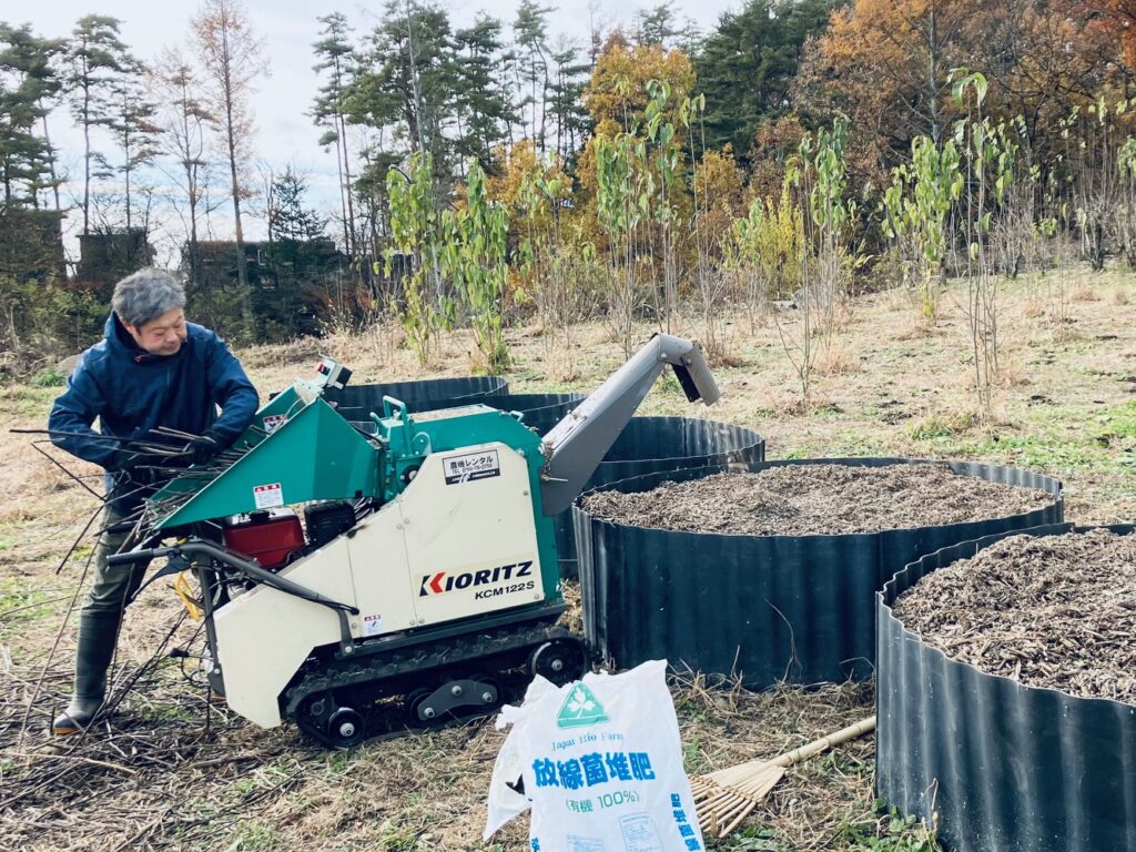 コンポスト作りには、収穫の際に発生する枝などの有機物に加え、チップの分解を助ける放線菌と、少量の窒素分を使用します。