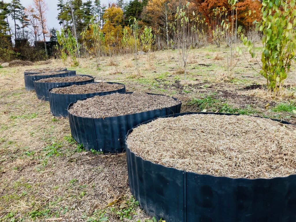 夏から始まった収穫作業と、乾燥させた杜仲の葉の回収が終わった11月に、年に一度のコンポスト作りを行いました。